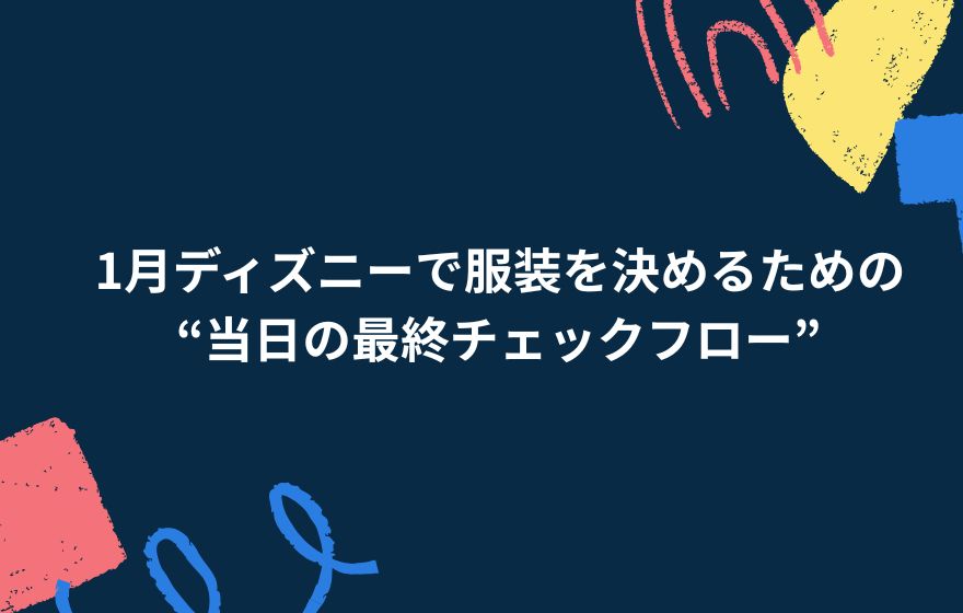 1月のディズニーは、一年の中でもっとも寒さが厳しい時期ですが、そのぶん空気が澄んで景色がきれいで、お正月ムードも楽しめる大好きなシーズンです。ベースレイヤー・ミドルレイヤー・アウター・小物の4つを意識してレイヤリングを組み、リアルタイム服装指数と当日の天気予報を組み合わせていけば、「寒さで楽しめなかった…」という失敗はかなり減らせます。